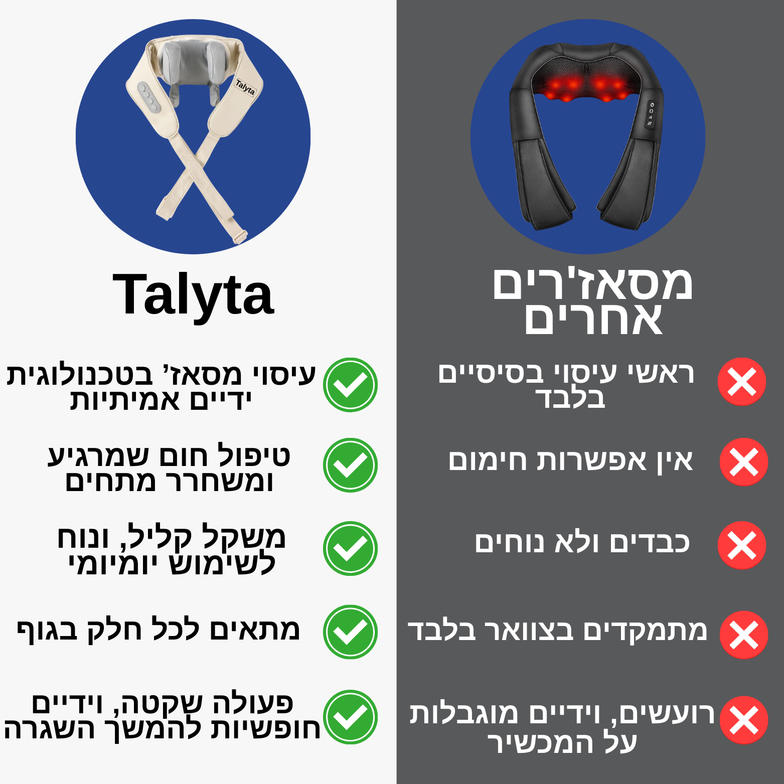 Talyta תוכנן במיוחד להתמקד בכאבי צוואר כרוניים, ומציע עיסוי עמוק ברקמות יחד עם טיפול בחום. השילוב הזה נמצא יעיל בהפחתת תסמיני כאב כרוני.